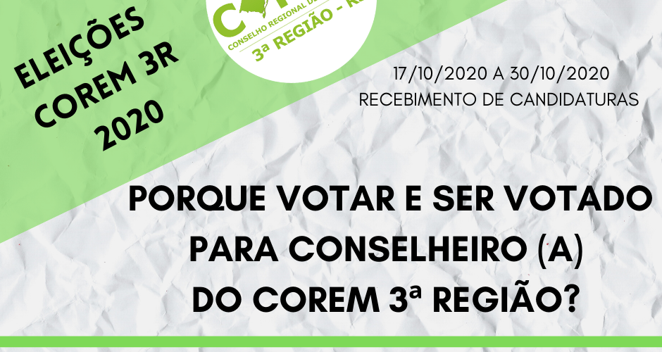 Chegou este momento, estamos no período eleitoral para a renovação de 1/3 dos atuais conselheiros (as) do seu COREM. Você é responsável por tal renovação, quer se candidatando, assim como exercendo o voto obrigatório por Lei.